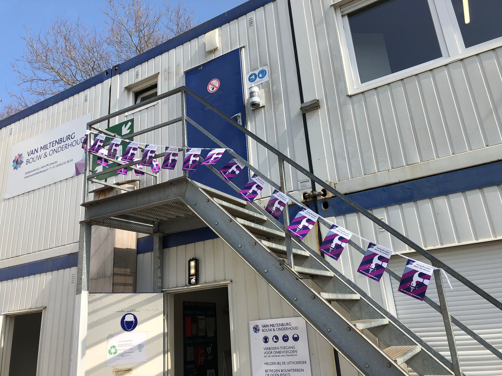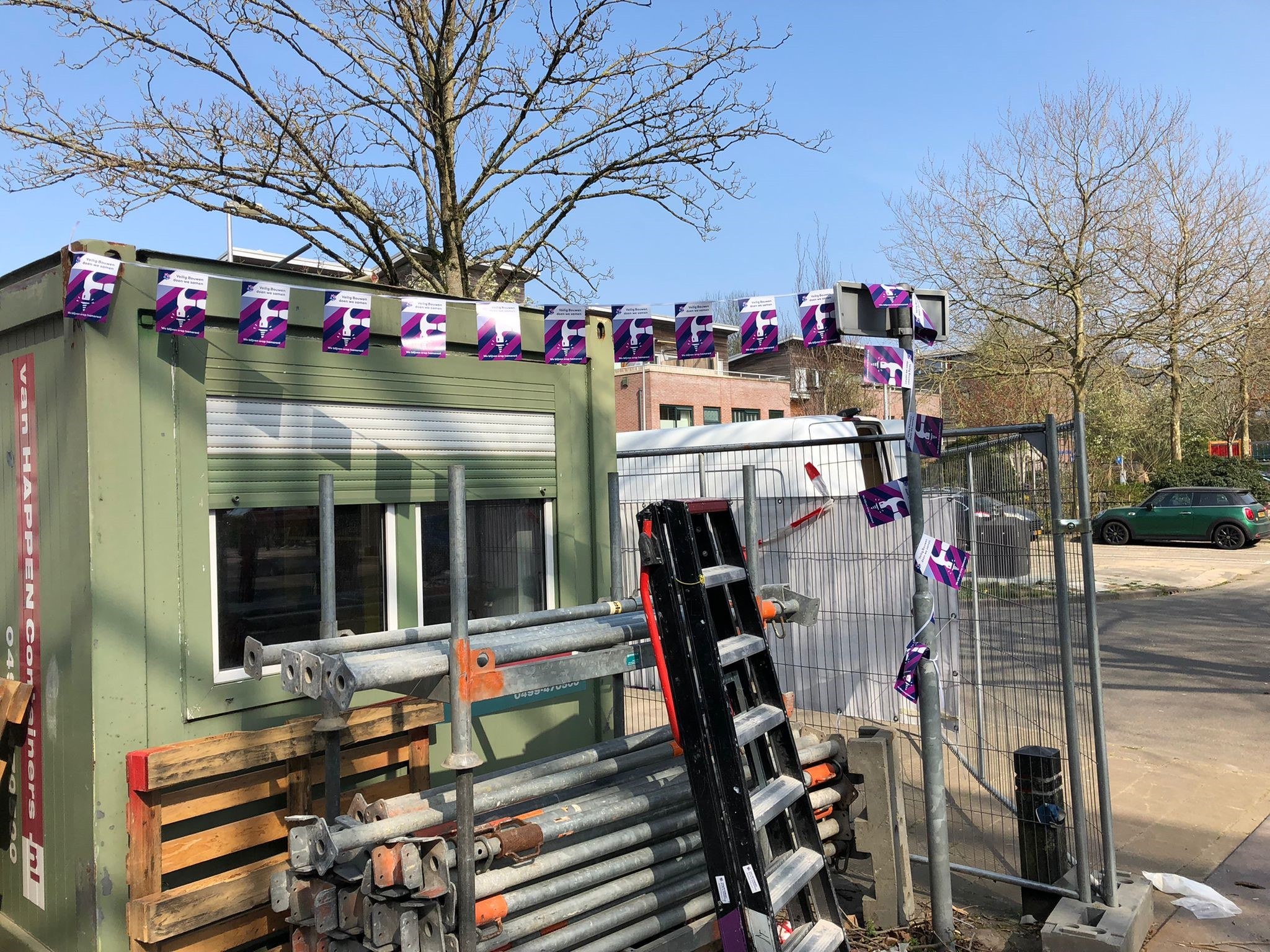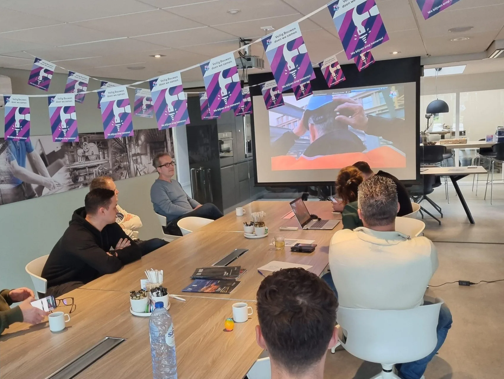 In onze bouwketen en kantoren hangen vlaggetjes op waarmee we bewustwording creëren en de Bewust Veilig-dag kenbaar maken. Gezamenlijk vindt er een Toolbox meeting plaats en kijken onze medewerkers via onze eigen VB Portal App naar een korte video omtrent veiligheid.